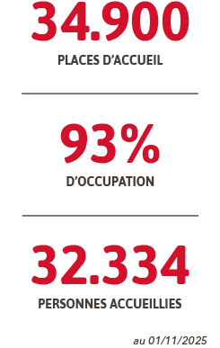 Fedasil et ses partenaires disposent, au 1er novembre 2025, d'une capacité d'accueil de 34.900 places réparties dans des centres collectifs et des logements individuels. 32.334 personnes y sont accueillies, soit un taux d’occupation de 93%.