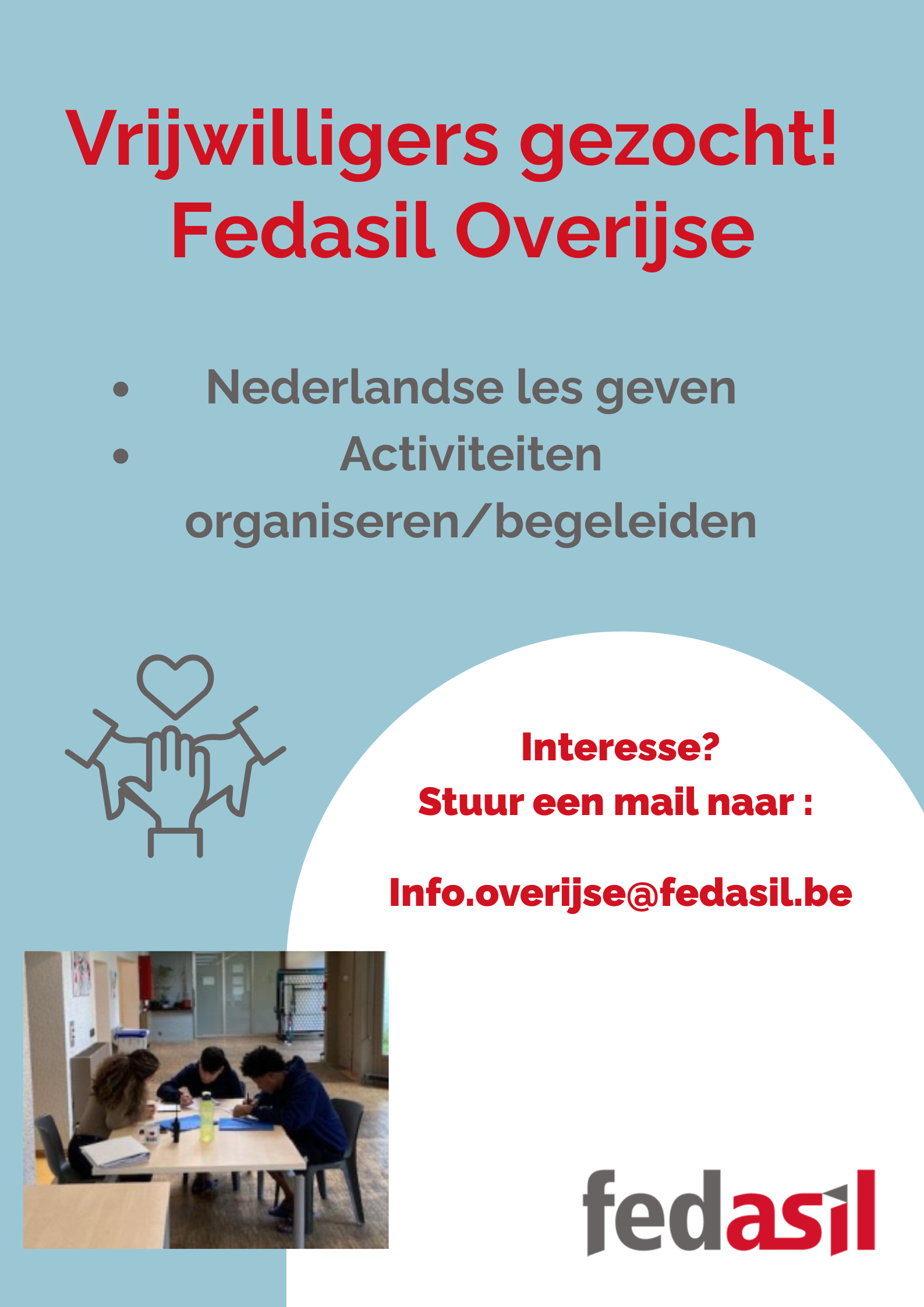 Fedasil Overijse is opzoek naar enthousiaste vrijwilligers, die zich graag inzetten voor niet begeleide minderjarige jongens en alleenstaande vrouwen. Wij zoeken vrijwilligers voor het geven van Nederlandse lessen en het organiseren/begeleiden van activiteiten. Aarzel niet om contact op te nemen voor extra informatie. info.overijse@fedasil.be