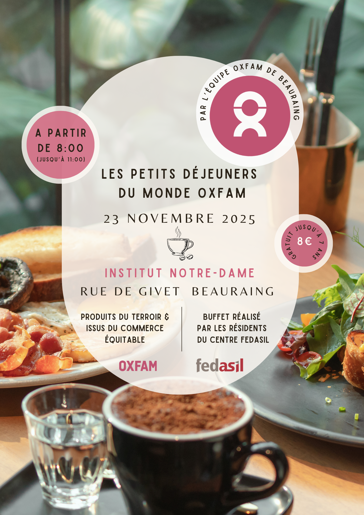 Le dimanche 23 novembre 2025 de 8h à 11h, Beauraing accueillera une nouvelle édition des Petits Déjeuners du Monde, organisée par l’équipe locale d’Oxfam-Magasins du monde.